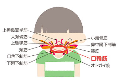 口輪筋は口の周りを囲むようにある筋肉で多くの表情筋につながっています。口輪筋や表情筋が緩んでくると口唇閉鎖不全症につながります。口唇閉鎖不全症は、口呼吸や鼻閉、気道閉塞、いびき、アレルギー疾患などとの関連が示唆されています。幼少期の発達時期から口輪筋を中心とした表情筋をトレーニングし、口唇閉鎖不全症を予防しましょう。